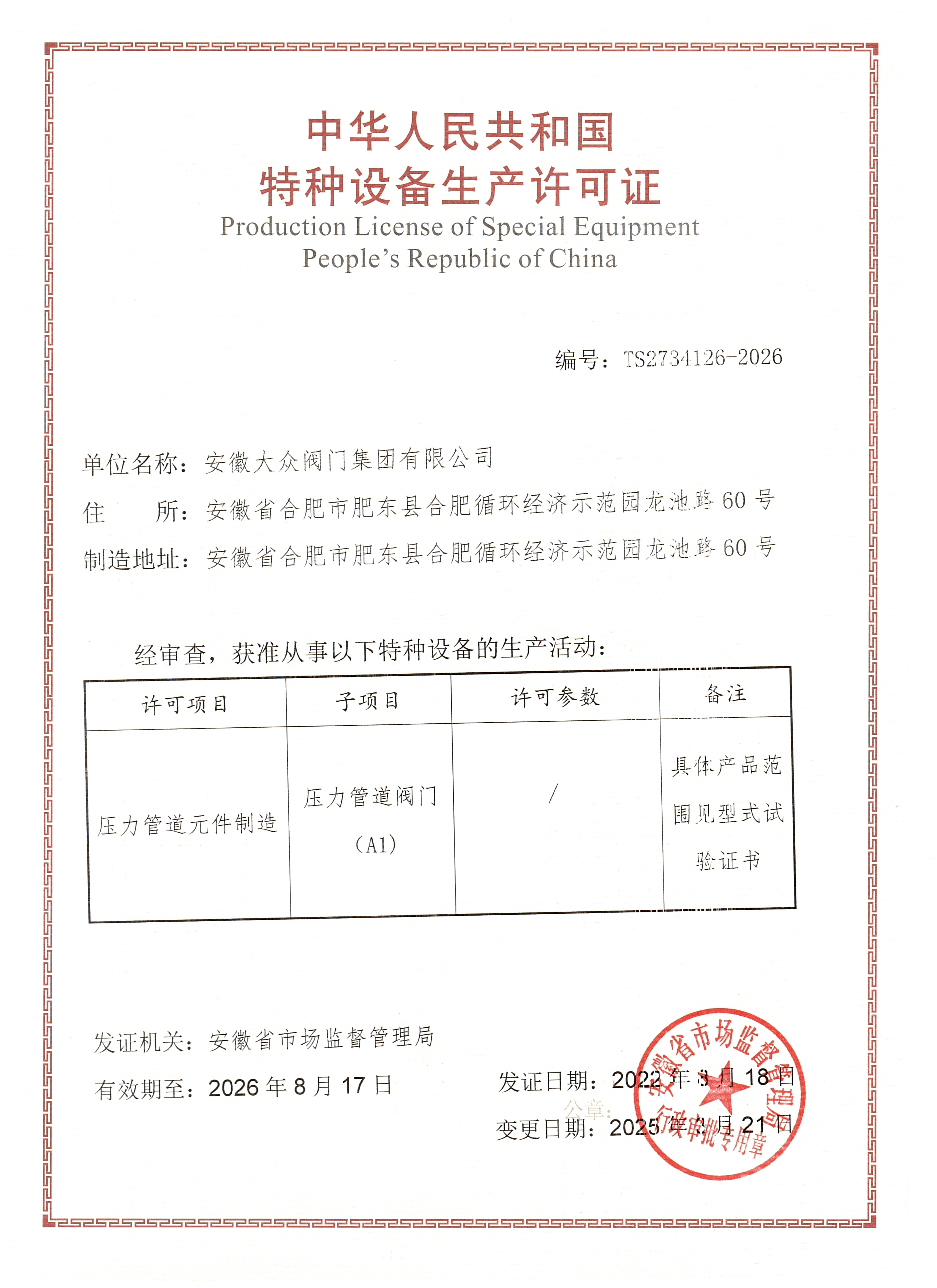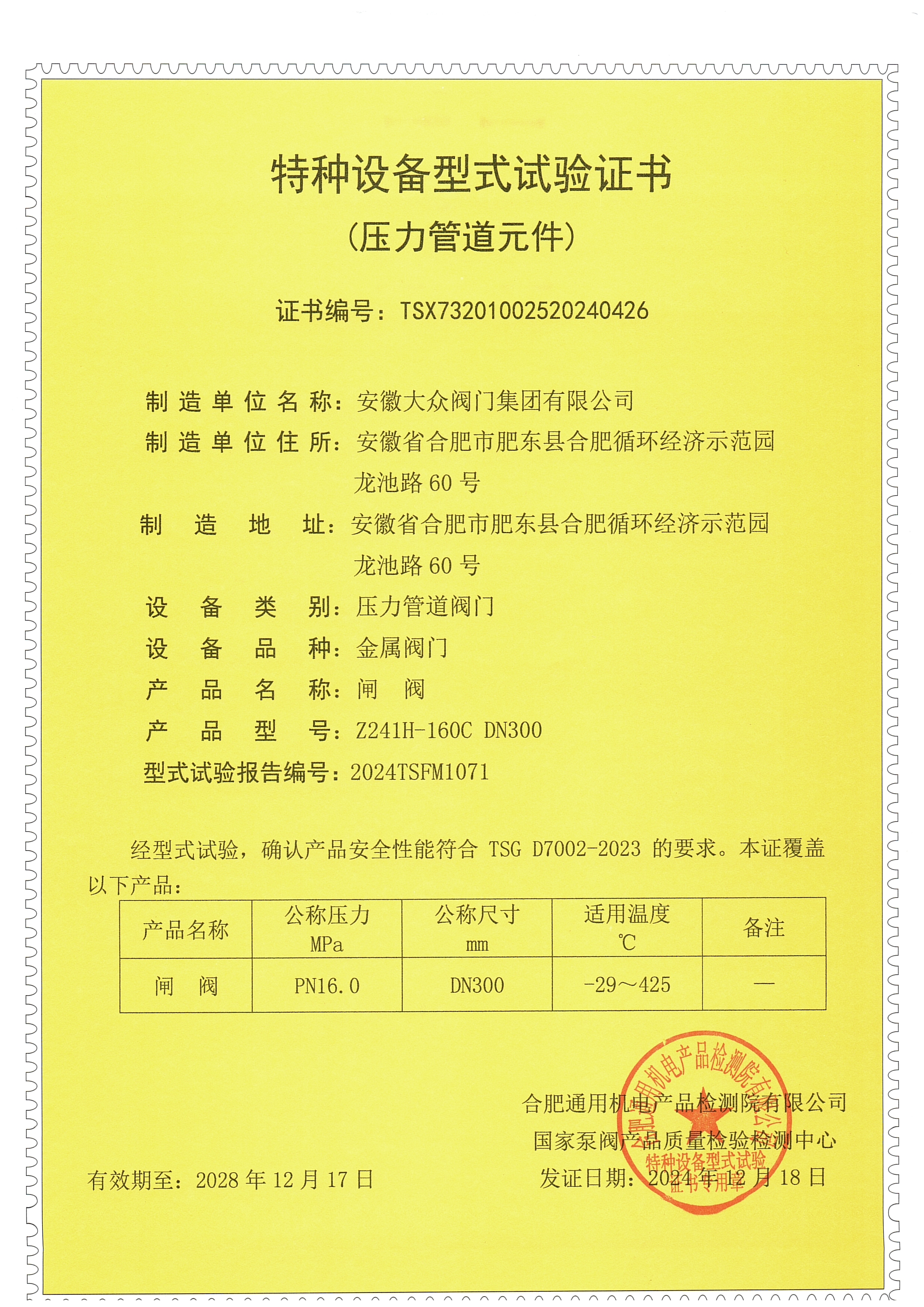 特种设备型式试验证书(闸阀)