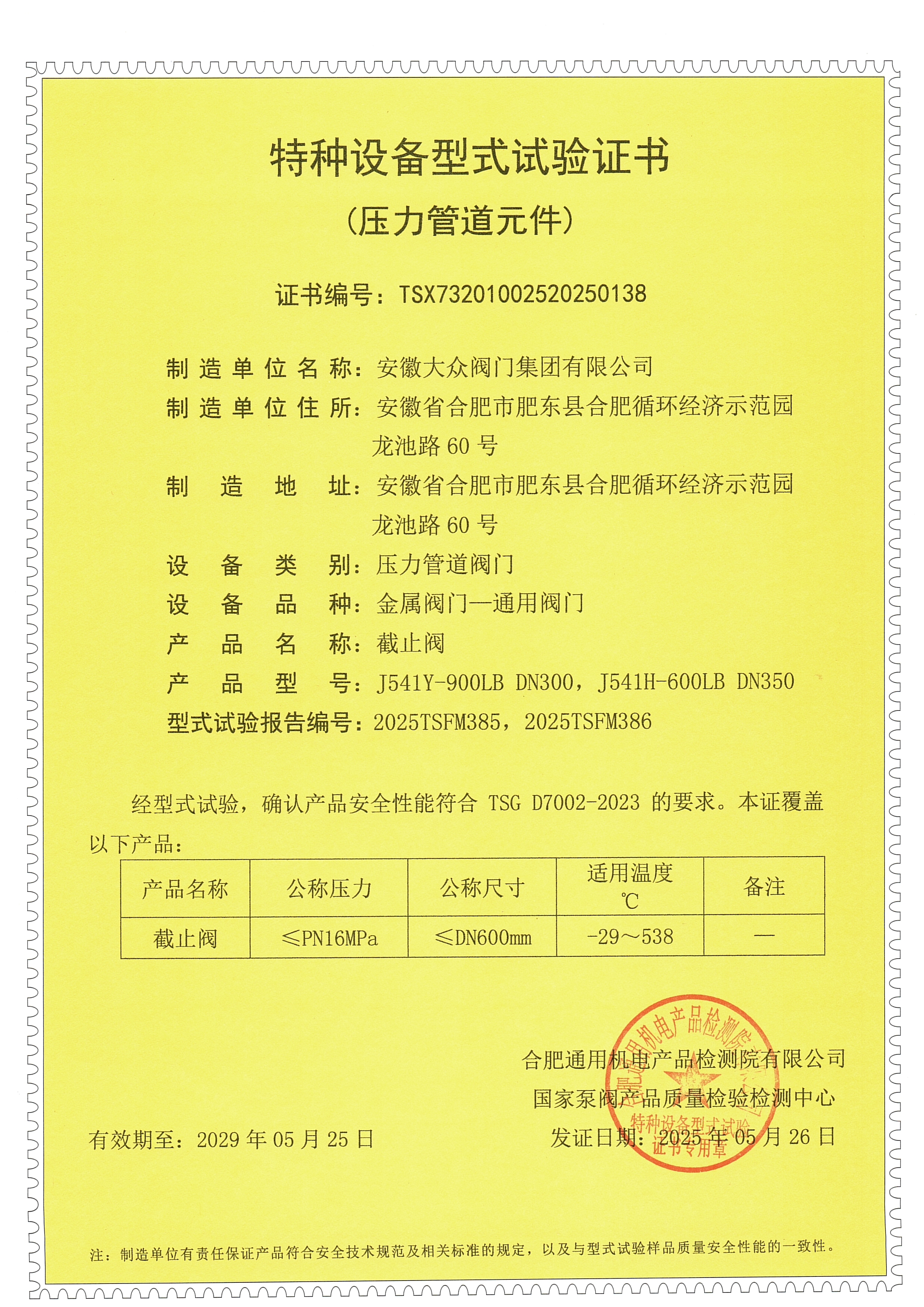 特种设备型式试验证书(截止阀)