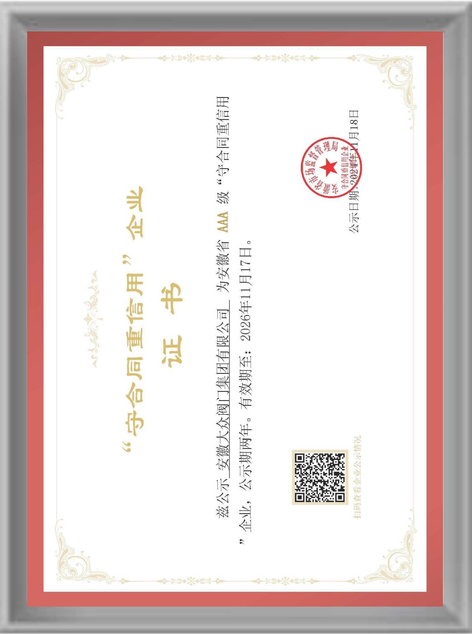 安徽省AAA级守合同重信用证书