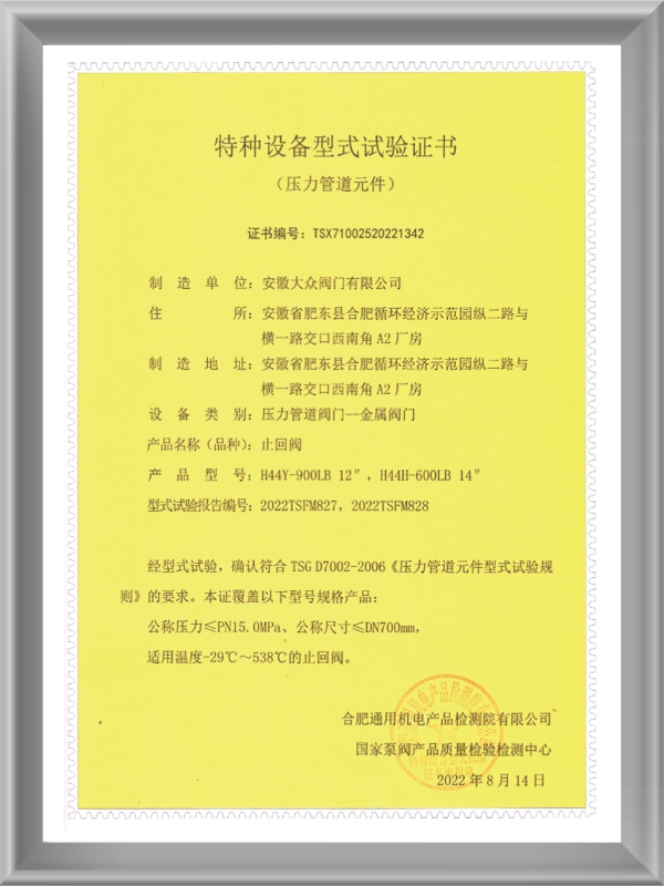 Special equipment type test certificate (check valve)